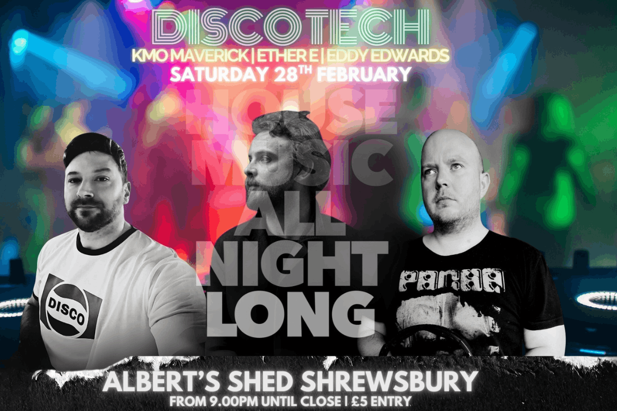 DISCOTECH Discotech is a House music record label based in Telford , Shropshire. It sprung from the collective vision of Ether E , Andrew ‘Eddy’ Edwards , Andy D & KMO Maverick to showcase the best in local House talent to a larger audience. AGE RESTRICTIONS + Add to Google Calendar + iCal / Outlook export Date 28 Feb 2026 Expired! Time 9:00 pm Location Albert's Shed Shrewsbury 8 Barker St, Shrewsbury SY1 1QJ Category Live MusicShrewsburyShrewsbury Gigs Share this event March 2026 Mar 14 2026 Devil in the Whiskey Albert's Shed Shrewsbury Mar 17 2026 INTERACTIVE QUIZ NIGHT Albert's Shed Southwater Mar 17 2026 JAM NIGHT Albert's Shed Shrewsbury Mar 18 2026 The Young Idea Albert's Shed Shrewsbury Mar 18 2026 GABBA GABBA HEY! DJS Albert's Shed Shrewsbury No event found! Load More